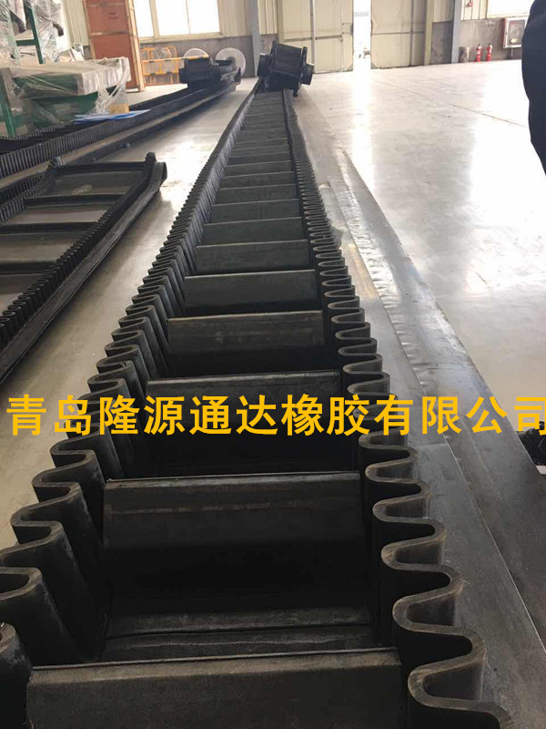 大傾角輸送帶廠家專業研發的擋邊輸送帶是由基帶、擋邊、橫隔板3部分組成。擋邊起防止物料測滑撒落的作用,為便于繞過滾筒,檔邊設計成波紋狀;橫隔板的作用是承托物料。